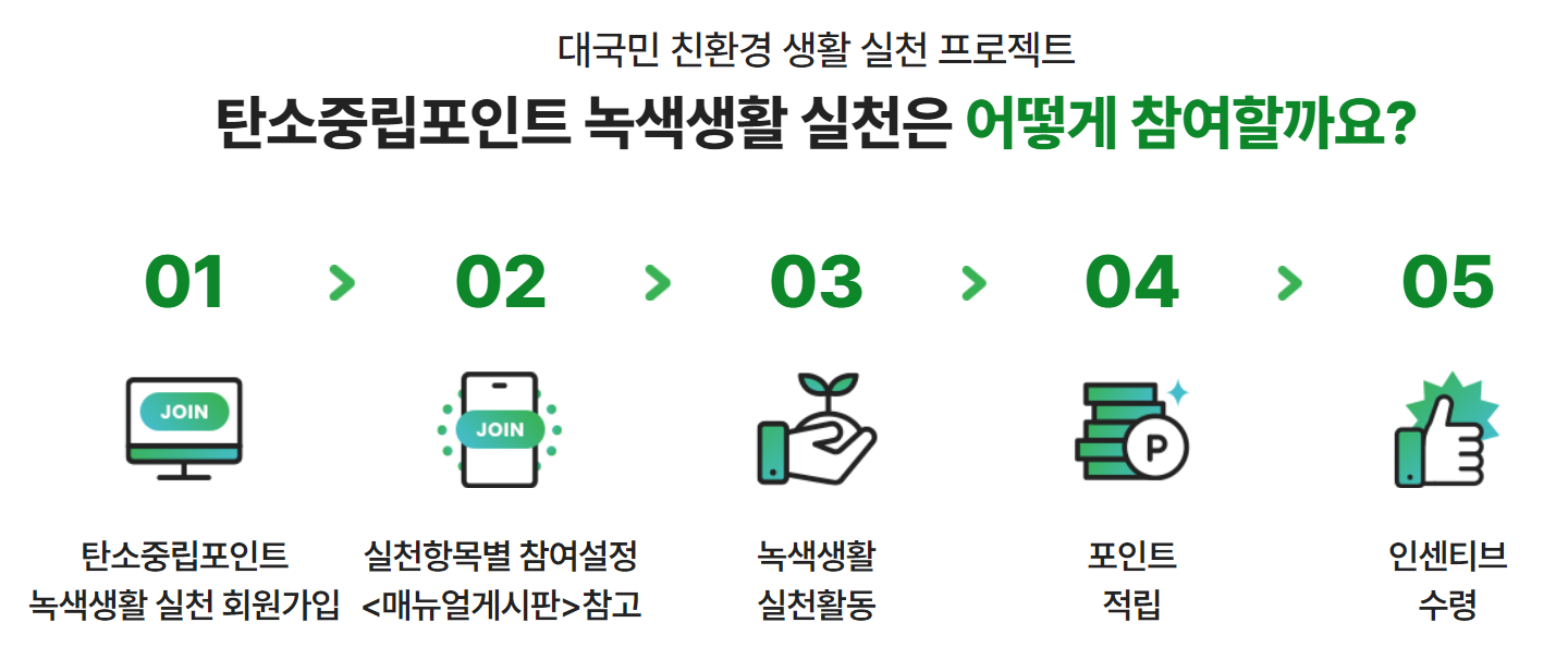 회원가입은 '그린카드', '탄소중립실천 포인트' 두 곳 모두 가입하셔야 합니다. 어느 한 곳이라도 가입되지 않으면 포인트가 적립되지 않습니다. 회원 가입 후, 종이 영수증이 아닌 전자 영수증을 요청하면 추가로 100원이 적립됩니다.