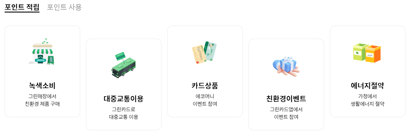 친환경 제품을 구매하고, 대중교통을 이용하는 등 온실가스 감축에 기여하는 소비자를 대상으로, 포인트 형태의 보조금을 지급하는 카드를 말한다. 2011년 7월 환경부와 한국환경산업기술원이 도입했다. [두산백과]