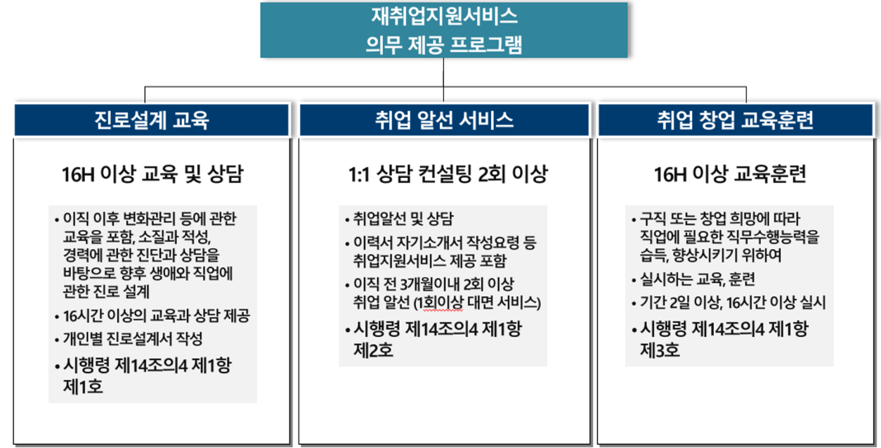 정부는 이렇게 재취업 지원 서비스를 도입한 300인 이상 기업의 사업주에게 재취업 지원 서비스 제도 설계 컨설팅 지원, 기업 인사 담당자 등에게 제도 안내 및 서비스 운영 관련 교육 제공, 업종별 표준 프로그램 개발·보급 등을 지원하고 있습니다.
