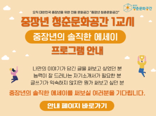 일상에 지친 중장년들이 삶에 새로운 활력을 가질 수 있도록 다양한 인문·문화 프로그램을 제공합니다.