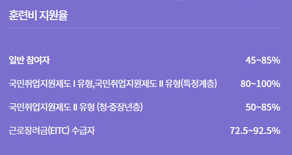- 훈련비의 45~85%를 국비로 지원합니다.