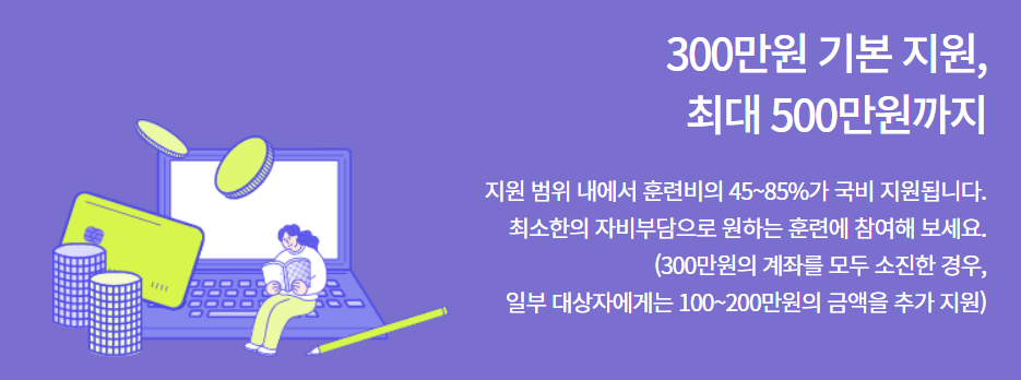 지원 범위 내에서 훈련비를 지원하고 나머지는 자비로 부담하게 됩니다.300만 원의 계좌를 모두 소진한 경우, 아래의 추가 지원 대상자에게는 100~200만 원의 금액을 추가 지원합니다.