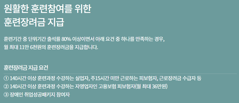 - 지원수준: 국민내일배움카드 유효기간 내 최초 1회 한해 훈련비를 전액 지원, 일정 요건 충족 시 훈련수당 추가 지원